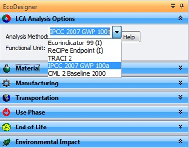 EcoDesigner peut-être personnalisé pour inclure des indicateurs environnementaux personnalisés et localiser les résultats selon la région afin d'avoir une analyse environnementale qui soit la plus réaliste possible. Eco-Indicator 99 (I) (Europe) & ReCipe Endpoint (I) (Europe)